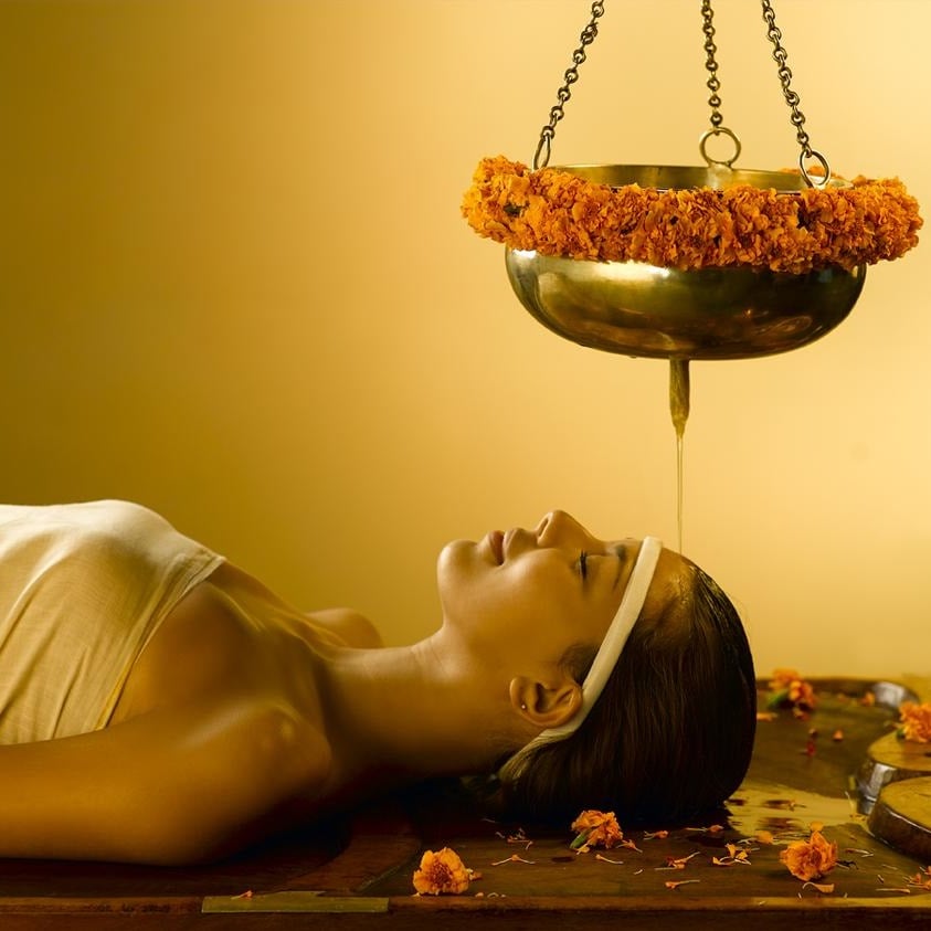 Shirodhara – a stream of oil is poured over forehead to increase mental calmness and to relieve anxiety